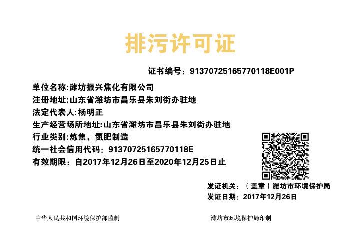 經(jīng)過(guò)近一個(gè)月的共同努力,振興焦化公司終于如期完成了環(huán)保排污許可證的辦理工作,12月26日,環(huán)保排污許可證順利發(fā)放,