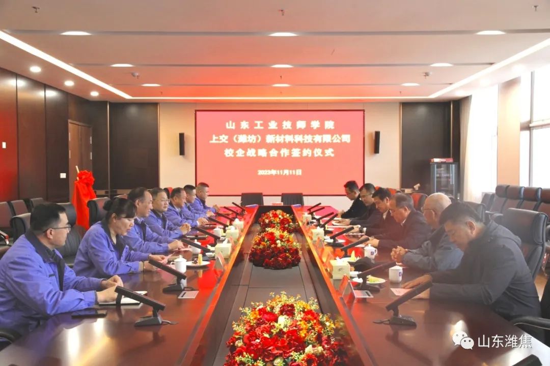 11月11日下午,上交(濰坊)新材料科技有限公司與山東工業(yè)技師學(xué)院校企戰(zhàn)略合作簽約儀式在集團總部舉行。濰坊市工業(yè)發(fā)展促 進中 心副主任王偉京、濰坊市工信局調(diào)研員李玉軍,山東工業(yè)技師學(xué)院黨委書記孫科順、副院長解成聯(lián),集團董事長劉良玉、總經(jīng)理王讀福、副總經(jīng)理呂紅、徐子寧等出席簽約儀式。