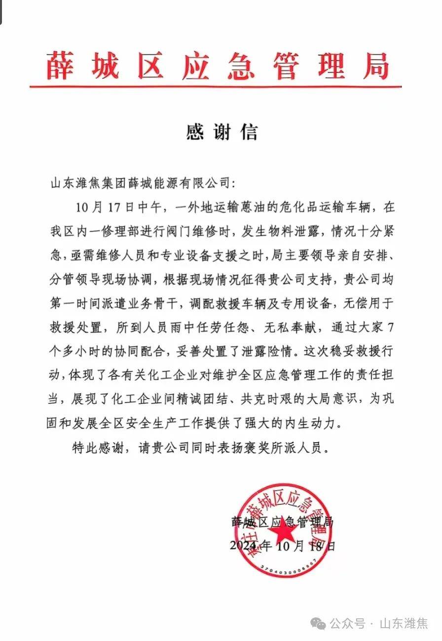 10月17日中午,一外地運輸蒽油的?;愤\輸車輛,在薛城區(qū)一車輛修理部進(jìn)行閥門維修時,突發(fā)危化品物料泄漏事故,情況十分緊急,薛城能源公司接訊后,派遣業(yè)務(wù)骨干,調(diào)配救援車輛及專用設(shè)備,無償用于救援處置。參加救援人員冒雨操作,任勞任怨、無私奉獻(xiàn),經(jīng)過7個多小時的協(xié)同配合、緊急救援,?;沸孤╇U情成功妥善處置。