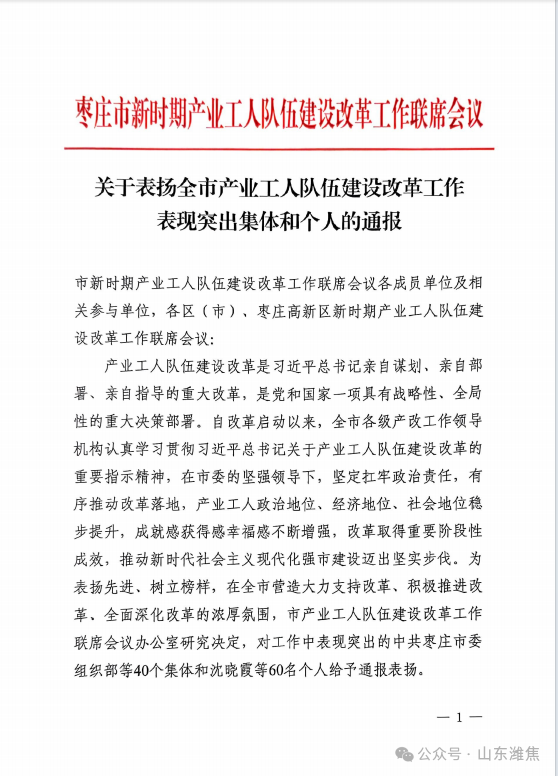 11月27日,棗莊市新時期產業工人隊伍建設改革工作聯席會議公布表彰名單,薛城能源公司榮獲“棗莊市產業工人隊伍建設改革工作表現突出集體”稱號。